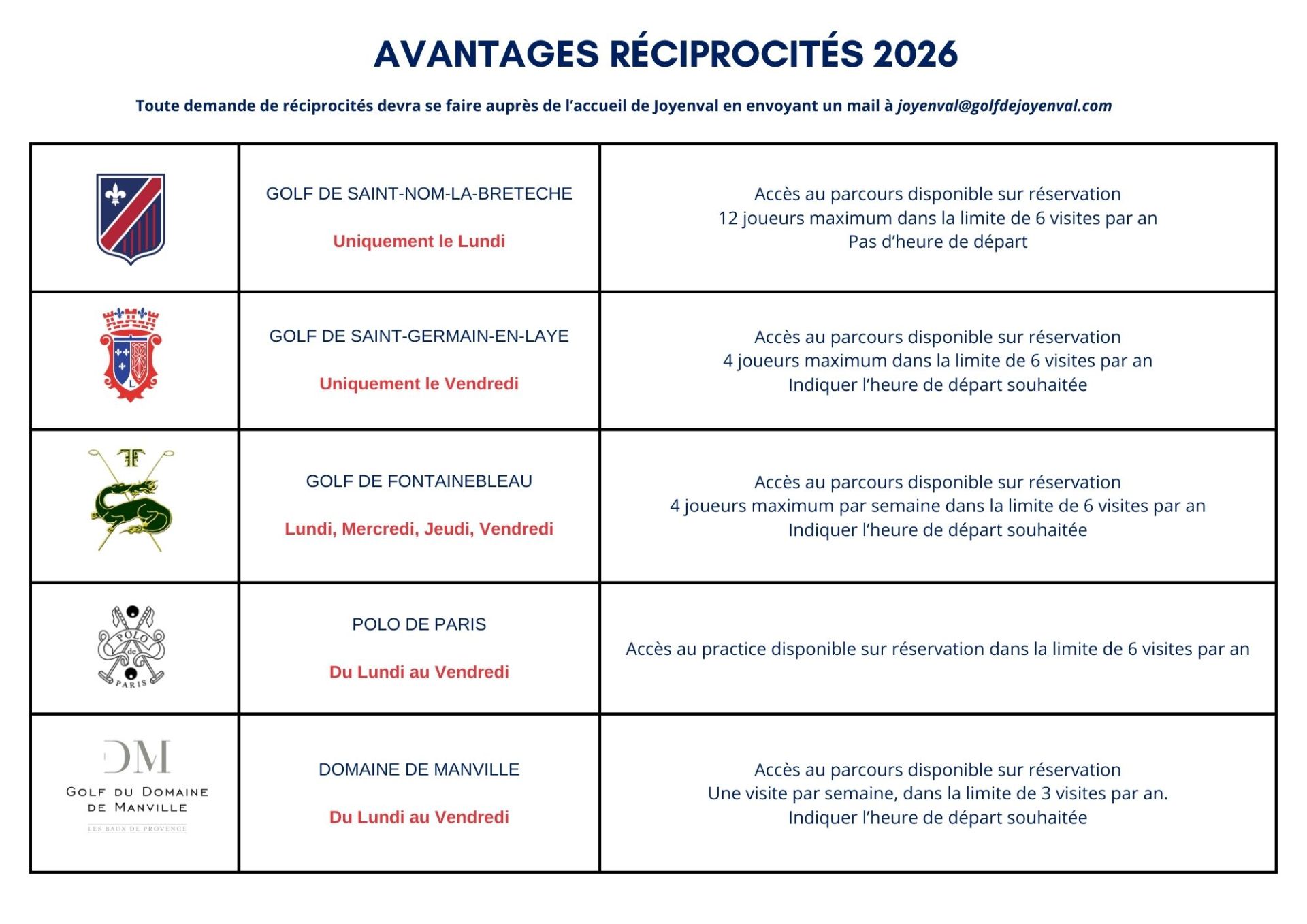 Pour bénéficier de ces accords de réciprocité, vous devez vous inscrire auprès du secrétariat du Golf de Joyenval qui annoncera votre arrivée.